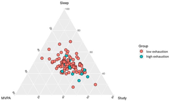 Ternary plot of the sample composition of time spent in sleep, MVPA, and study. Colored points represent groups of low (red) and high emotional exhaustion (blue).