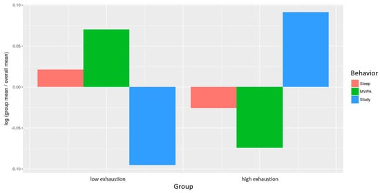 The composition of the day for the two different groups of lowly emotionally exhausted and highly emotionally exhausted participants is shown in Figure 2. For the compositional analysis of the relative distribution of times spent in the three types of behavior, for each group, the log-ratio between the group compositional mean and the overall compositional mean of the complete sample after centering the data was used []. Results show that for highly emotionally exhausted participants, time spent studying is around 9% higher (exp (0.09) = 1.094), whereas for lowly emotionally exhausted participants it is around 9% lower relative to the overall mean composition. For MVPA, an opposite effect occurs: for highly emotionally exhausted participants, time spent in moderate to vigorous physical activity is around 7% lower, whereas for lowly emotionally exhausted participants, it is around 7% higher relative to the overall mean composition.