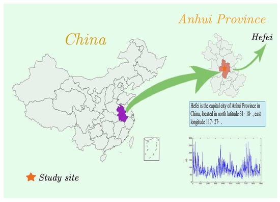Hefei is the capital city of Anhui Province in China, located at north latitude 18, east longitude 27 (Figure 1). Hefei is an important national science and education center and the first national science and technology innovation city. Hefei is also one of the famous tourist cities. With the development of the economy, the air quality of Hefei is also getting worse, which poses a threat to people’s health and travel. Therefore, accurately forecasting the AQI index can provide good advice for people’s outdoor activities. In this study, the data of AQI were collected from the web sites http://www.zhb.gov.cn/ and http://www.tianqihoubao.com/aqi/hefei.html. We selected the dataset of daily AQI from 1 January 2016–31 May 2018 with a total of 884 observations; the mean was 85.00; the maximum was 275; the minimum was 17. The class of AQI in Hefei ranged from Class I–Class V (Figure 1). The sample data were partitioned into subsets, i.e., training set (1 January 2016–30 April 2018) and testing set (1 May 2018–30 May 2018).