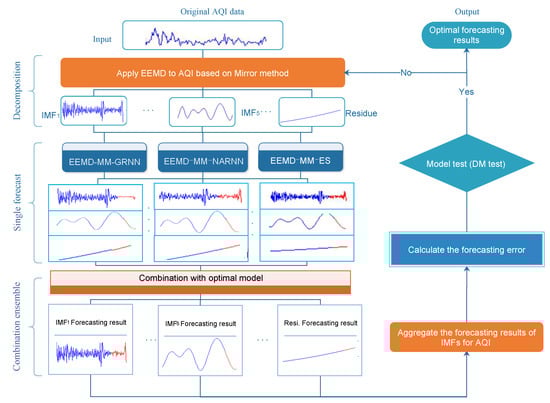 To enhance forecasting accuracy, a hybrid forecasting approach with EEMD based on the mirror method and the optimal combined forecasting model is proposed for AQI forecasting. We introduce the mirror method for eliminating the impact of the endpoints because the endpoints adversely affect the results of the decomposition by EEMD. Meanwhile, in order to address the difficult problem of how to choose the model for forecasting the IMFs and residue, we propose a varied weight combined forecasting model. The framework of the proposed hybrid forecasting approach is as illustrated in Figure 2.