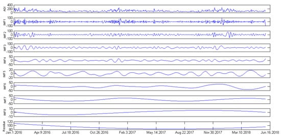 The EEMD technique, first proposed by Huang et al., is a kind of adaptive signal decomposition technique using the Hilbert–Huang transform (HHT). The EEMD technique is an improvement of the EMD technique [], and it can be employed to nonlinear and non-stationary time series. The EEMD technique decomposes the original series into IMFs and residue. The IMF is a function that satisfies two conditions: