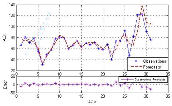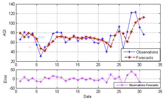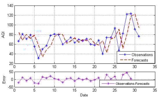 Furthermore, DM tests were employed for statistical demonstration, as the statistics were listed with a p-value, shown in Table 3. Through the DM test, generally speaking, the proposed hybrid forecasting model outperforms the EEMD-MM-GRNN and EEMD-MM-NARNN models at a 5% level of statistical significance; and outperforms the EEMD-MM-ES, GRNN, NARNN and ES models at a 1% level of statistical significance. The results indicate that the proposed model can be statistically verified as significantly better than the other benchmark models, and it is proven again that the proposed model is an effective model for AQI forecasting.