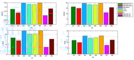 The proposed hybrid forecasting model, i.e., EEMD-MM-CFM, and their seven benchmark models, including EEMD-MM-GRNN, EEMD-MM-NARNN, EEMD-MM-ES, GRNN, NARNN, ES and EEMD-MM-SAM, were used to forecast the AQI in Hefei. The performance comparison results are given in Figure 9 and Figure 10. From the results, we can obtain that the proposed model can be statistically proven to outperform all considered benchmark models in AQI forecasting in Hefei. In particular, the proposed model does not only get the lowest error, but also achieves high mode accuracy. Furthermore, the DM test statistically verifies the superiority of the proposed model over all benchmark models under the confidence level of 95%.