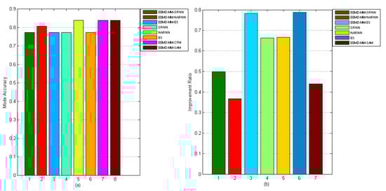 Regarding mode accuracy, the MMA results are presented in the part a in Figure 10, and similar conclusions can be found. The MMA of the proposed model is better than the EEMD-MM-GRNN, EEMD-MM-NARNN, EEMD-MM-ES, GRNN and ES models and is equal to the NARNN and EEMD-MM-SAM models. From the part b in Figure 10, we can see that the proposed model is an improvement over the other benchmark models. For instance, the maximum improvement percentage is for the ES model (78.72%), and the minimum improvement percentage is for the EEMD-MM-NARNN model (36.64%). Meanwhile, the correlation coefficient results are presented in Table 2. From Table 2, we can obtain three important conclusions. First, the proposed model (EEMD-MM-CFM) performs significantly better than all considered benchmark models. Second, when comparing the individual models (i.e., ES, NARNN and GRNN) with the according decomposition-ensemble models (i.e., EEMD-MM-ES, EEMD-MM-NARNN and EEMD-MM-GRNN), the values of the correlation coefficient corresponding to decomposition-ensemble models are larger than the individual models. Third, when comparing the proposed model with the simple arithmetic combined model (i.e., EEMD-MM-SAM), the proposed model is superior to the EEMD-MM-SAM model. Accordingly, the proposed model is an effective tool for AQI forecasting.