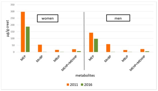 - Göen, T.; Dobler, L.; Koschorreck, J.; Müller, J.; Wiesmüller, G.A.; Drexler, H.; Lolossa-Gehring, M. Trends of the internal phthalate exposure of young adults in Germany—Follow up of a retrospective human biomonitoring study. Int. J. Hyg. Environ. Health 2011, 215, 36–45. [Google Scholar] [CrossRef] [PubMed]