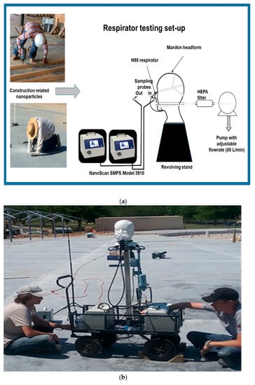 (a) Schematic of the respirator evaluation system for assessing protection offered by N95 filtering facepiece respirators in construction jobsites. (b) Photograph of the manikin-based N95 respirator evaluation set-up in a concrete blasting construction job site.