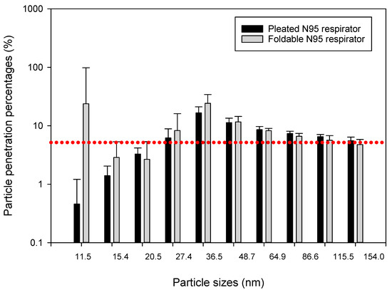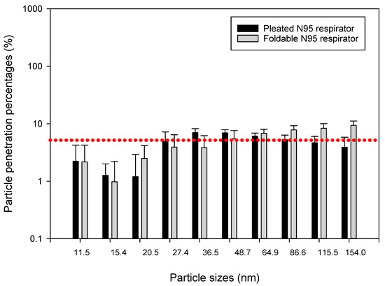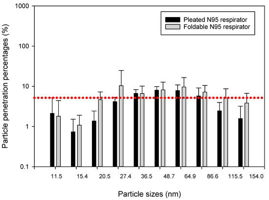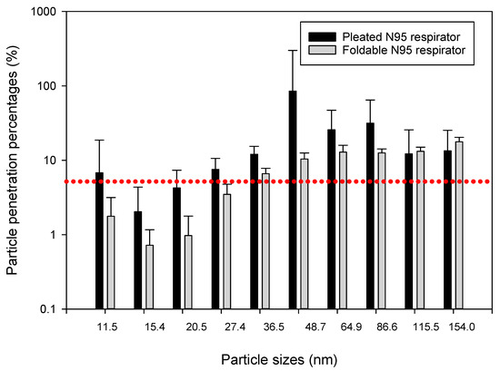 Penetration percentages of particles of 11.4–154.0 nm size range in isopropanol treated N95 masks during wooden building frameworks construction. The dotted red line indicates the 5% particle penetration percentages, to be considered as the efficacy threshold for N95 respirators.