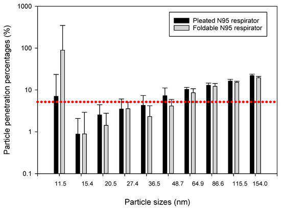 We found that penetration of ultrafine particles differed with respect to particle size, as well as the type of N95 masks. N95 respirators may not provide 95% protection for all categories of ultrafine particles, including the subset of nanoparticles. We found that ultrafine particles of <36.5 nm size generally penetrated least through both types of pleated and foldable respirator models when compared with other particle sizes (except a few exceptions for 11.5 nm particles).