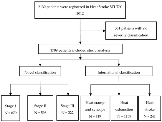 Yamamoto, T.; Fujita, M.; Oda, Y.; Todani, M.; Hifumi, T.; Kondo, Y.; Shimazaki, J.; Shiraishi, S.; Hayashida, K.; Yokobori, S.; et al. Evaluation of a Novel Classification of Heat-Related Illnesses: A Multicentre Observational Study (Heat Stroke STUDY 2012). Int. J. Environ. Res. Public Health 2018, 15, 1962. https://doi.org/10.3390/ijerph15091962