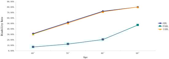 Disability rates of ADL, PADL, and IADL among the elderly at different ages.