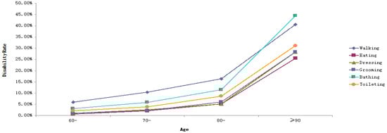 With the development of the ageing population, the health condition of the elderly and the major influencing factors have attracted significant scholarly attention. Dealing with the risks and burdens of disability caused by ageing is crucial. The ability of daily life (ADL) refers to the most basic and common body movements that people must perform repeatedly every day to live independently []. ADL consists of physical activities of daily living (PADL) and instrumental activities of daily living (IADL) []. Several studies [,,] found significant differences in ADL disability rates among the elderly in different regions. For example, a survey conducted by the Mexican Health and Ageing Research Center (MHAS) for older Mexicans aged 80 years and older found that in the 2000–2001 and 2010–2012 cohort studies, the MHAS ADL disability rates increased from 37.5% to 44.0%, indicating that, as time goes by, the disability rate of ADL increased as well []. A survey of 23,815 elderly people in Brazil with an average age of 69.8 years reported an ADL disability rate of 30.1% []. A 2002 study on the ADL disability rates of the elderly in China revealed the disability rates of 6.9%, 23.6%, and 42.7% among the age groups of 65–79, 80–89, and 90–99 years old, respectively (total disability rate: 41.0%) []. At present, although many studies on ADL disability have been published, most have examined overall ADL or IADL disability. Few studies have analyzed disability from the overall effect on each item. Hence, the purpose of the current study is to investigate the possible influencing factors of disability (ADL, PADL, IADL, and 14 items) among the elderly people aged 60 and above, who are living in the county we studied (Guangxi Province, China).