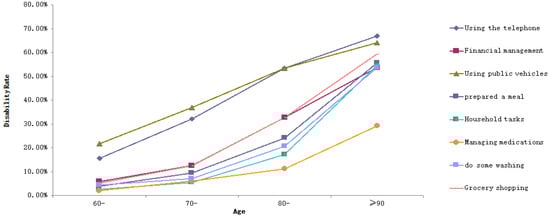 The trend chi-square test showed that the rate of disability increased with age. Logistic regression analysis results also indicated that age was the influencing factor for disability, as all the results (ADL, PADL, IADL, and 14 items) showed that the older the age was, the higher the OR value was. This finding is consistent with many studies [,,,]. In a study of the global burden of disease, Salomon et al. [] found positive correlation between years of disability and life expectancy. Suzuki’s study of disability in Japan discovered that, although the functional capabilities of older people living in the Japanese community have improved over the past two decades, as age increased, the daily functional ability of the elderly worsened []. Three possible factors can explain this. First, in terms of research site, the elderly involved in the survey are mainly doing farming activities in the rural areas. Second, with the increase in age, various organic or functional changes occur in the elderly, and the prevalence of chronic diseases has thus has increased. Third, given the high proportion of empty-nest elderly people in rural areas, psychological problems, such as loneliness and depression, are more common among this population. In addition, walking is recognized as a predictor for the onset of ADL disability in the elderly []. Among the six items of PADL in this study, walking has the highest rate of disability, which also increases with age. Further, this finding supports the notion that the rate of disability increases with age. The reasons for the highest disability rate of using the telephone may be that, first, local economic conditions are poor, and some elderly people have never left the area. Mobile phones are new tools for them, and because they rarely interact with the outside world, they might have certain difficulties in using mobile phones. Second, many elderly people have declining hearing and vision as they age, which adds difficulty in making calls in daily life. Regarding the use of public vehicles, the local public vehicle is special, and tricycles are different from buses in cities. Many elderly people seldom go outside and if they do need to go out, they must have better ability in their physical coordination to get on and off vehicles. Many of them have difficulties in completing daily activities because the body function and coordination are declining. Hence, proposing measures allowing the elderly to maintain good daily living functions is an important and urgent task.