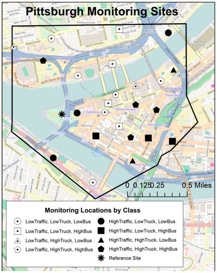 Downtown Pittsburgh monitoring locations (n = 24) and reference site by class dichotomization (total traffic density, truck traffic density, bus route density). Rural upwind reference site to the west (~14.5 km) of the study area is not shown.