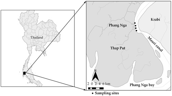 The pooled oyster meat and estuarine water samples were collected each month from four different oyster locations in Thap Put district (Latitude 8.541530 and Longitude 98.638060 or degree 8°32′29.508′′ N and 98°38′17.016′′ E) at Phang Nga Bay along the Andaman Sea in southern Thailand (Figure 1). The map was created by the QGIS program version 2.18 (Las Palma de Gran Canaria, Spain). Environmental samples were measured daily by an air flow meter anemometer wind meter on sampling day, and average 7-day parameters prior to sampling were retrieved from the Thai meteorological department. Wind parameters averaged over the 12 months from March 2016 to February 2017 were 1.22 ± 0.89 m/s for current wind speed, 1.67 ± 1.09 m/s for instantaneous wind speed, and 0.91 ± 0.57 m/s for average wind speed. The highest current wind spend (4.05 m/s), instantaneous wind speed (5.08 m/s), and average wind speed (2.73 m/s) were observed during winter, while the lowest current wind speed (0.53 m/s), instantaneous wind speed (0.68 m/s), and average wind speed (0.53 m/s) were reported during the summer. Temperature fluctuated between 28.9 °C in winter and 34.9 °C in summer with an average temperature at 31.6 °C, typical of tropical coastal ecosystems in SE Asia. The average RH was 73.7% and ranged from 49.5–88.7%. Precipitation was limited to six months in May, June, August, and September through November in 2016.