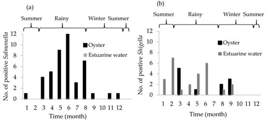 Number of positive samples for Salmonella spp. (n = 44/144) and Shigella spp. (n = 11/144): (a) The number of positive Salmonella samples; (b) The number of postitive Shigella samples of pooled oysters and estuarine water from Phang Nga Bay, southern Thailand. Sample collection started from March 2016 (month 1) to February 2017 (month 12).