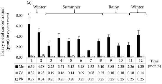 Average concentrations and standard deviation of Mn, Cd, and Pb in pooled oyster meat were 3.41 (±0.12), 0.16 (±0.01) and 0.26 (±0.01) ppm, respectively (Figure 3), which was much higher compared to estuarine water samples which had levels of Mn of 0.05 (±0.0) ppm and below the detection limit of 0.01–0.02 ppm for Pb and Cd, respectively. The highest metal contamination in pooled oyster meat occurred in March for Mn (6.39 ppm) and Cd (0.32 ppm) and in April for Pb (0.34 ppm).