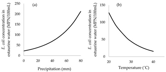 Predicted average concentration of EC (MPN/100 mL of estuarine water) as a function of: (a) average precipitation over 7 days; (b) ambient air temperature