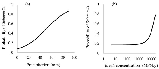 Predicted probability of detecting Salmonella in pooled oyster samples as a function of: (a) average precipitation during previous 7 days; (b) the levels of EC (MPN/g oyster meat).