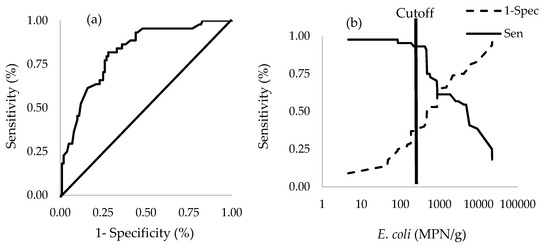 Accuracy for using EC to predict Salmonella contamination in pooled oyster samples: (a) ROC curve; (b) sensitivity and specificity for using EC concentration (MPN/g oyster meat) to predict Salmonella contamination in oysters, with a vertical line indicating the optimal cutoff value of 420 EC (MPN/g) based on the Youden index.