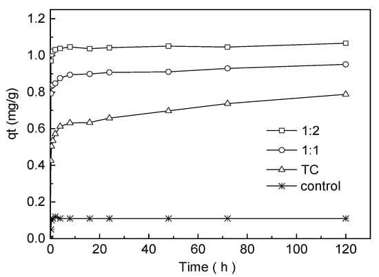 2.5.1. Adsorption Kinetics of TC in the Presence/Absence of Cu