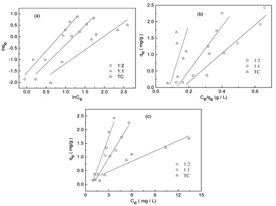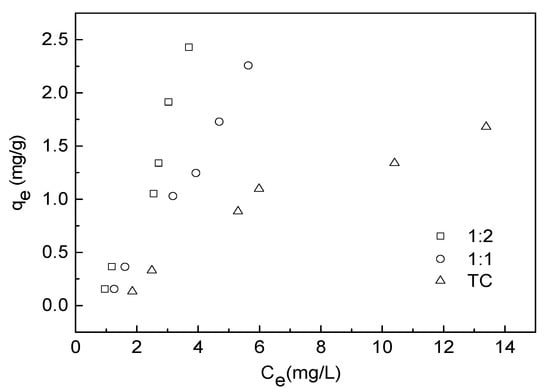 2.5.2. Adsorption Isotherm of TC in the Presence/Absence of Cu