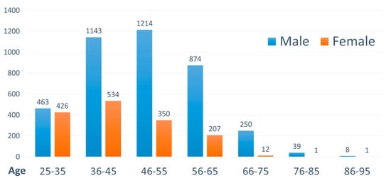 A total of 5522 practicing TCMPs in 2012 were selected for the analysis. Of them, 1531 were women. The studied TCMPs were aged between 25 and 95 years (Figure 1). As displayed in the figure, for those between 35 and 75 years old, the ratio of male to female physicians was large, at 3.51:1 (3481:1003); however, for those between 25 and 35 years old, the ratio was closer to 1:1 (463:426), indicating an increase in the number of young female TCMPs.