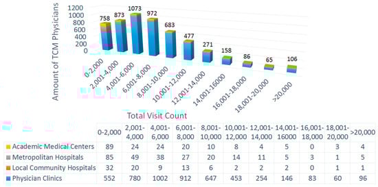 As shown in the distribution chart (Figure 2), 4985 TCMPs (90.3%) provided services in primary clinics. Most of the TCMPs (78.9%) had a total visit count lower than 10,000, and 87.5% of TCMPs had a total visit count lower than 12,000; and the peak range for total visit count was 4001–6000 visits. The TCMPs that mostly provided services in academic medical centers had visit counts below 2000 (89 physicians, 46.6%). For the 106 TCMPs with total visit counts above 20,000, 90.6% worked in primary clinics.