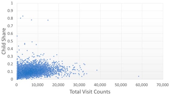 Distribution of pediatric visits with total visit counts by each TCMP. A higher pediatric visitation ratio indicates that the TCMP treated more children.