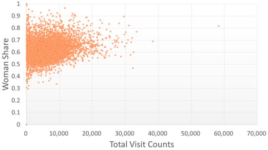 Distribution of female patient visits with total visit counts by each TCMP. A higher ratio of female patients indicates that the TCMP treated more female patients.