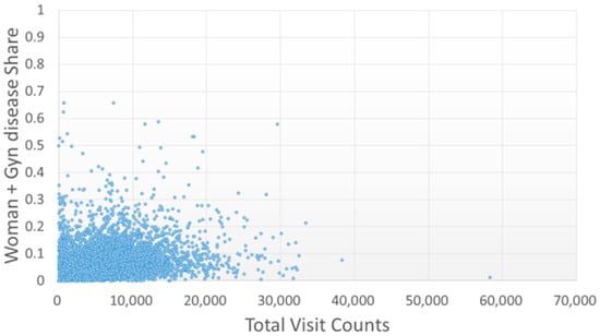 Distribution of gynecology-related treatments with total visit counts by each TCMP. A higher proportion indicates that the TCMP provided more gynecological treatments to female patients (Gyn disease).
