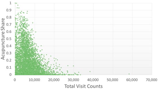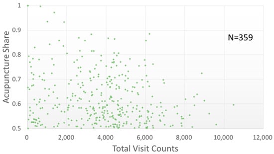 Distribution of acupuncture proportion (above 0.5) with total visit counts by each TCMP. The TCMPs represented in this figure administered acupuncture therapy to more than half of their patients.