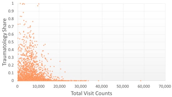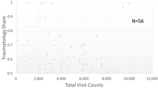 Distribution of traumatology proportion (over 0.5) with total visit counts by each TCMP. The TCMPs represented in this figure used traumatology-related manipulative therapy to treat more than half of their patients.