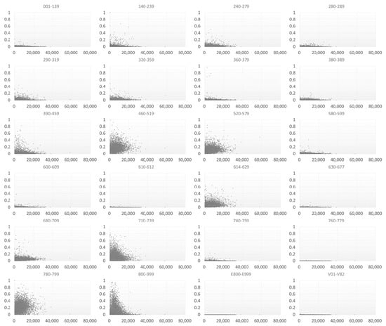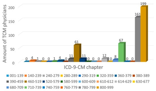 Most of the studied TCMPs had acupuncture treatment ratios smaller than 0.5 (Figure 6). Of the 359 physicians with acupuncture treatment ratios larger than 0.5 (i.e., more than one in every two patients visited the physician for acupuncture), only one TCMP had a total visit count of over 10,000 (Figure 7). The traumatology treatment proportion is shown in Figure 8. Of the 56 TCMPs with traumatology ratios above 0.5, none had a total visit count exceeding 10,000 (Figure 9). Additionally, as depicted in Figure 10, most of the ICD-9-CM codes for the TCM patients were categorized under “Diseases of the Respiratory System”, “Diseases of the Digestive System”, “Diseases of the Skin and Subcutaneous Tissue”, “Diseases of the Musculoskeletal System and Connective Tissue”, or “Diseases of the Female Genital Organs” groupings. Proportions of patients with ICD-9-CM codes falling under “Symptoms, Signs, and Ill-Defined Conditions”, and the “Injury and Poisoning” grouping were also high. “Infectious and Parasitic Diseases”, “Neoplasms”, “Endocrine, Nutritional and Metabolic Diseases and Immunity Disorders”, “Diseases of the Blood and Blood-Forming Organs”, “Mental Disorders”, “Diseases of the Nervous System”, “Diseases of the Eye and Adnexa”, “Diseases of the Ear and Mastoid Process”, “Diseases of the Circulatory System”, “Diseases of the Urinary System”, “Diseases of the Male Genital Organs”, “Disorders of Breast”, “Complications of Pregnancy, Child Birth, and the Puerperium” and “Diseases of the Skin and Subcutaneous Tissue” groupings were comparatively few. Of the TCMPs with grouping proportions higher than 0.5 (Figure 11), 199 TCMPs applied the most ICD-9-CM codes from “Injury and Poisoning”, 161 from “Symptoms, Signs and Ill-Defined Conditions”, 67 from “Diseases of the Musculoskeletal System and Connective Tissue”, 61 from “Diseases of the Respiratory System”, 12 from “Diseases of Female Genital Organs”, 11 from “Diseases of the Circulatory System” and “Diseases of the Digestive System”, 8 from “Diseases of the Skin and Subcutaneous Tissue”, 4 from “Neoplasms” and “Diseases of the Eye and Adnexa” and 1 from “Endocrine, Nutritional and Metabolic Diseases and Immunity Disorders” and “Diseases of the Nervous System”. No other grouping proportions calculated from TCMP-applied ICD-9-CM codes were higher than 0.5.