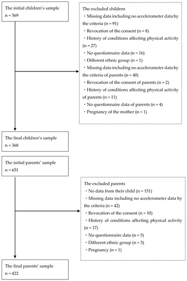 In the questionnaire, responses to Q1 and Q2 were categorized into two groups according to the distribution of each answer. Q3, Q4, and Q6 were categorized into “yes” or “no” according to the answers of “rarely and occasionally” or “often and always”. Q5 was categorized into “unimportant”, “somewhat important” or “important” according to the answers of “unimportant”, “somewhat important” or “important and very important”. The associations between children’s percentage of MVPA (%MVPA) or % sedentary time and their parent’s activity or behavior were examined using mixed linear regression models. MVPA and sedentary time were divided by total wear time to obtain %MVPA and %sedentary time, respectively. We analyzed the associations between factors of the children’s mothers and fathers, separately. Gender, grade, and body mass index z-score of the children were included in the models as confounders. Families nested in the schools were also included as random effects. When the parent’s activity was an independent variable, their age was included as a cofounder. As summarized in Figure 1, the initial children’s sample comprised 569 participants. Due to missing data including no accelerometer data by the above-mentioned criteria (n = 91), revocation of the agreement (n = 8), history of conditions affecting PA, such as respiratory disease or heart disease (n = 27), no questionnaire data (n = 16), different ethnic group (n = 1), missing data including no accelerometer data by the criteria of parents (n = 40), revocation of the consent of parents (n = 2), history of conditions affecting PA of parents (n = 11), no questionnaire data of parents (n = 4), and pregnancy of the mother (n = 1), the final study sample comprised data from 368 children. The initial parents’ sample comprised 651 participants. Due to missing data including no accelerometer data, no data from their child (n = 151), no above-mentioned criteria (n = 42), revocation of the agreement (n = 10), history of conditions affecting PA, such as respiratory disease or heart disease (n = 17), no questionnaire data (n = 5), different ethnic group (n = 3), and pregnancy (n = 1), the final study sample comprised data from 422 parents. There was no significant difference in the age, body weight, and body height of the study group and the children who withdrew from the study. There was no significant difference in the age of the study group and the parents who withdrew from the study. The statistical analyses were performed using SAS 9.4 (SAS Institute Inc., Cary, NC, USA), with p < 0.05 considered statistically significant.