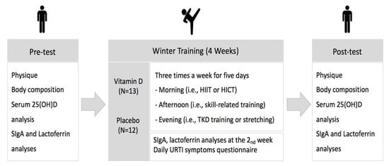 Taekwondo athletes may be more likely to present low vitamin D levels, since the majority of their training takes place indoors, therefore decreasing their sunlight exposure time. Also, the weight category in sport may decrease the athletes’ vitamin D supplementation via food intake []. Taekwondo athletes generally prepare for their upcoming season during the winter period and training programs include various types of high-intensity interval training and endurance training [,]. We believe that vitamin D insufficiency during winter training may negatively influence the athletes’ respiratory immune functions. Therefore, this study examined the effects of vitamin D3 supplementation on salivary immune functions and URTI symptoms during winter training in vitamin D-insufficient taekwondo athletes. It was hypothesized that four weeks of vitamin D3 supplementation will increase serum 25(OH)D level. An increased serum 25(OH)D level will improve salivary immune functions and symptoms of URTI in vitamin D-insufficient taekwondo athletes.
