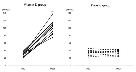 Individual changes of serum 25(OH)D concentration from pre- to post-tests. * p < 0.05 indicates a significant increase from pre- to post-tests in the vitamin D group.