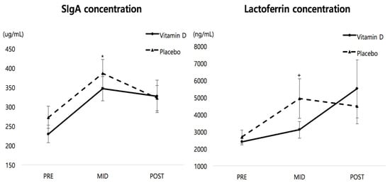 Changes in SIgA and lactoferrin concentrations. Note: * p < 0.05 indicates that SIgA concentration increased in both groups from pre- to mid -tests, + p < 0.05 indicates that lactoferrin concentration increased only in the placebo group from pre- to mid-tests.