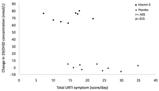 Correlation between the change in 25(OH)D concentration and total URTI symptom. Note: number of missing data from the vitamin D group was five while the placebo group was three; the correlations within each group were not significant (Vitamin D group, r = 0.143, p = 0.621, Placebo group, r = −0.366, p = 0.173, respectively).