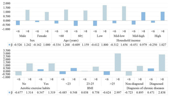 We also performed sub-group analysis for linear regression analysis between sleep duration and BA-CA differences to investigate BA-CA differences, according to household income, BMI, and diagnosis of chronic diseases. The results are shown in Figure 1. Larger differences between BA and CA with longer sleep duration were more prevalent in lower income groups than others. However, there were no statistically significant results in the short sleep group (less than 6 h per day). In the results by BMI or diagnosis of chronic diseases, the increases in BA with long sleep duration were more frequent in obese groups or people with the diagnosis of chronic diseases.