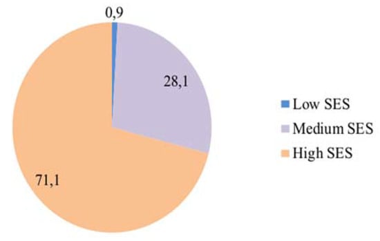 Descriptive data for the sample indicated that 49.4% were female (n = 116) and 50.6% were male (n = 119). Participants’ ages ranged from 14.0 to 18.1 years old, with a mean age of 15.5 ± 0.9 years old. Mean BMI was 22.1 ± 2.9 kg/m2 and the mean percentile value was 64.8 ± 24.1. In line with WHO criteria [29], the prevalence of overweight was 25.5% and of obesity 4.7%, indicating a total prevalence of overweight of 30.2%. Regarding SES, the mean score obtained using the FAS II questionnaire was 6.3 ± 1.6, corresponding to a high SES. As can be seen in Figure 1, 29% of the adolescents presented a medium-low SES and 71.1% a high SES. An analysis of the relationship between SES and overweight indicated that students with a medium-low SES presented a two-fold higher probability of being overweight (OR: 2.43; 95% CI: 1.33–4.40; p = 0.003).