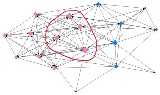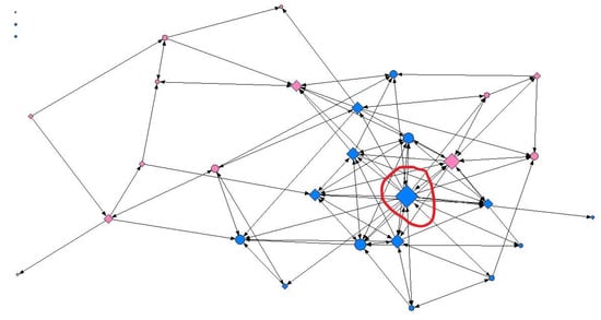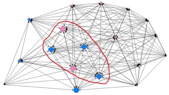 For each contact intensity matrix, an analysis was conducted of the seven parameters representing social network centrality [36] from a sociocentric or global perspective: (i) outdegree (nominations emitted); (ii) indegree (nominations received); (iii) degree (number of ties that one actor has) [36]; (iv–v) closeness (in/outcloseness) (number of steps that one actor must take to reach another) [37,38]; (vi) betweenness (degree of connections that pass through an actor for one actor to reach another) [37,38]; and (vii) the eigenvector (a measure to identify the most central actors with the shortest distance to the rest of the nodes) [39]. This analysis yielded 21 normalized variables (values in which the ends were relativized) organized dichotomously according to the median for each parameter.
