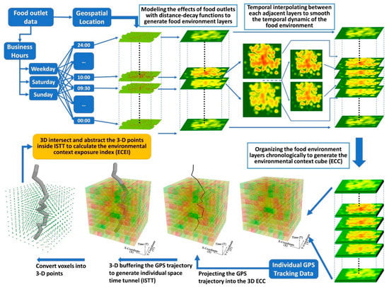 To address the challenges of the UGCoP, this paper proposes an analytical framework that utilizes GIS, time geography and GPS trajectory data to assess individual food environmental exposures for environmental health studies. In the framework, an environmental context cube (ECC) integrates variations in the food environment over space and time into a 3-D cube. By buffering individual GPS trajectories in 3-D to generate the individual space-time tunnel (ISTT) and projecting it into the ECC, environmental exposures can be derived and assessed by identifying the 3-D intersection of the ISTT and ECC. Based on the intersection, we calculate the environmental context exposure index (ECEI) as a standardized measure of individual exposure to the food environment. Considering both the spatiotemporal variations in the food environment and the dynamics of people’s daily movement, the ECEI may provide a more accurate and reliable measurement of individual exposure to the food environment. The ECEI is utilized in this study to explore the relationship between individual food environment exposures and the overweight status for 46 participants using data collected with GPS in Columbus, Ohio, and binary logistic regression models. The results indicate that the proposed framework is effective for assessing individual exposures and investigating their health effects when compared with other widely used food environment exposures assessment methods. Addressing the spatiotemporal variations of contextual influences, the framework may help mitigate the spatial and temporal uncertainties in the food environment in public health studies. Further, the methodology is also useful in a wide range of environmental health research.