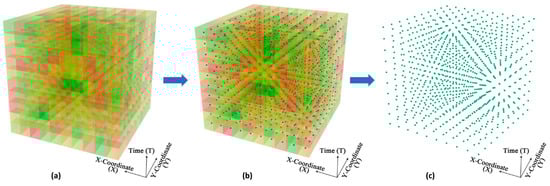 To facilitate the implementation and computation of the 3-D environmental context cubes (ECCs), we converted each 3-D ECC to a 3-D point cloud, with each voxel in the cube represented by a point in the cloud at the centroid of the original voxel. As shown in Figure 5, the three dimensions of the points correspond to the x-coordinate (X), y-coordinate (Y), and time (T) seen in the original ECC. The values of the environmental factors were stored as an attribute table linked to each point in the 3-D point cloud.
