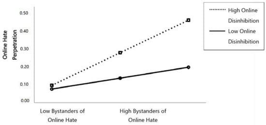 As Figure 1 shows, significant moderation effects were found between bystanders of online hate and toxic online disinhibition when predicting online hate perpetration (b = 0.07, SE = 0.27, p = 0.007). Probing the interaction further revealed that bystanders of online hate reported more online hate perpetration when they reported higher levels of online disinhibition (b = 0.14, SE = 0.02, p < 0.001 at +1 SD) and less frequent online hate perpetration when they reported lower levels of toxic online disinhibition (b = 0.04, SE = 0.02, p = 0.029 at −1 SD).