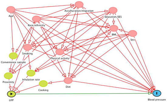 From these articles, we identified 21 risk factors for hypertension and high blood pressure (acculturation/migration, age, alcohol, BMI, caffeine/coffee/cocoa, DASH diet, diabetes, dietary fiber/protein supplementation, education/SES, estradiol, glucocorticoids, physical activity, potassium, race, racial discrimination, sex, smoking, sodium intake, statins, stress, and vitamin C). We examined the pairwise relationships between UFP and each of the identified risk factors [19,98,99,100,101,102,103,104,105,106,107]. We prioritized evidence from meta-analyses, systematic reviews, reviews, or consensus statements that addressed direct and indirect (within two steps) determinants of personal exposure to UFP. If these types of articles were not available, we considered evidence from experimental studies, cohort studies, and other study designs (in that order). We used the same evidence prioritization method to assess the relationships among potential covariates [90,108,109,110,111,112,113,114,115,116,117,118,119,120,121,122,123,124,125,126,127,128,129,130,131]. We also considered relationships that were introduced by the study design. For example, convenience sampling was done in specific retirement communities so age was considered an ancestor of UFP exposure. Based on all of the pairwise relationships, we built the DAG in DAGitty v2.3 [132]. The code for the DAG is below.