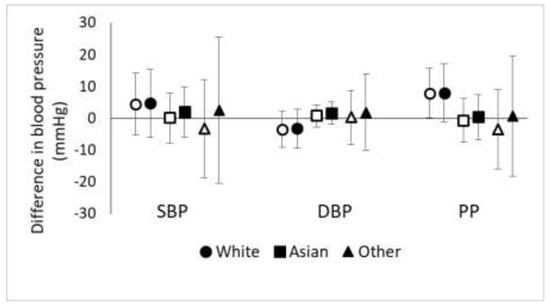 Effect modification of the association of ln(TAA-PNC) with blood pressure by race/ethnicity. Open markers represent unadjusted associations (Model A) while solid markers represent adjusted associations (Model B; adjusted for BMI, sex, smoking, physical activity, and diet as fried food consumption).