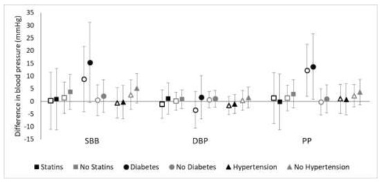 Effect modification of the association of ln(TAA-PNC) with blood pressure by statin medication use, diabetes status, and hypertension status. Open markers represent unadjusted associations (Model A) while solid markers represent adjusted associations (Model B; adjusted for BMI, sex, smoking, physical activity, and diet as fried food consumption).