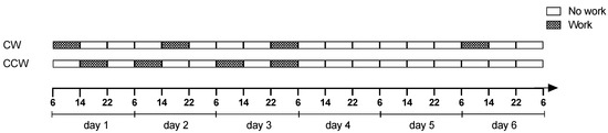 Figure 1. Work schedule of CW (Clockwise) and CCW (counterclockwise) rotating nurses over an entire shift cycle.