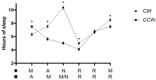 Figure 2. Hours of sleep in the 24 h before each shift or rest days. Note that the CW (clockwise) rotating nurses slept an average of 10 h before the night shift. The CCW (counterclockwise) rotating nurses had a morning shift and a night shift on the 3rd day of the shift cycle and slept an average of 5 h in the 24 h preceding the night shift. Of interest, both the CW and CCW rotating nurses slept the lowest number of hours following the night shift (5 h and 4 h, respectively). M: morning shift (6 a.m.–2 p.m.); A: afternoon shift (2 p.m.–10 p.m.); N: Night shift (10 p.m.–6 a.m.); R: Rest days; M/N: indicates where CCW nurses worked both morning and night shift on the same day; * p < 0.05 CW vs. CCW.