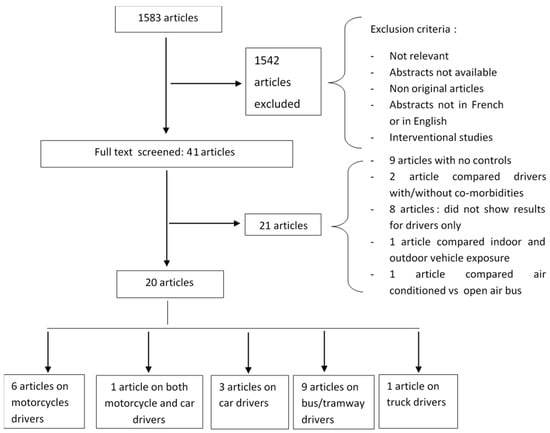 The initial search retrieved 1583 published articles, of which 1542 were excluded based on their titles and abstracts. A full evaluation of 41 papers found 20 articles relating to commercial motorcycles, including cars, buses, and trucks (Table 3, Table 4, Table 5 and Table 6). The 21 non-included papers were excluded on the basis of: nine articles having no comparative group; two papers comparing drivers with/without co-morbidities; eight articles not reporting results for drivers only; one article comparing indoor and outdoor vehicle exposure; and one article comparing air-conditioned vs. open air buses (Figure 1).